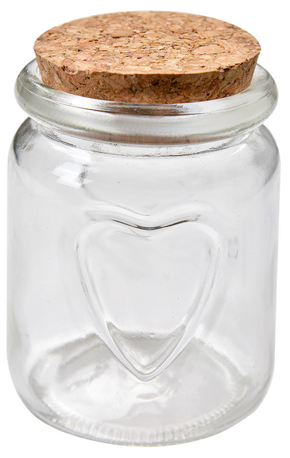 En liten glasburk med korklock och dekorativ hjärtform på framsidan. Perfekt för småsaker som godis, kryddor eller andra små favoriter. Det klara glaset låter innehållet synas på ett fint sätt, medan korklocket ger burken en varm och naturlig känsla.