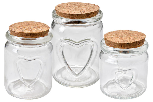 En liten glasburk med korklock och dekorativ hjärtform på framsidan, perfekt för småsaker som godis, kryddor eller andra små favoriter. Läs mer