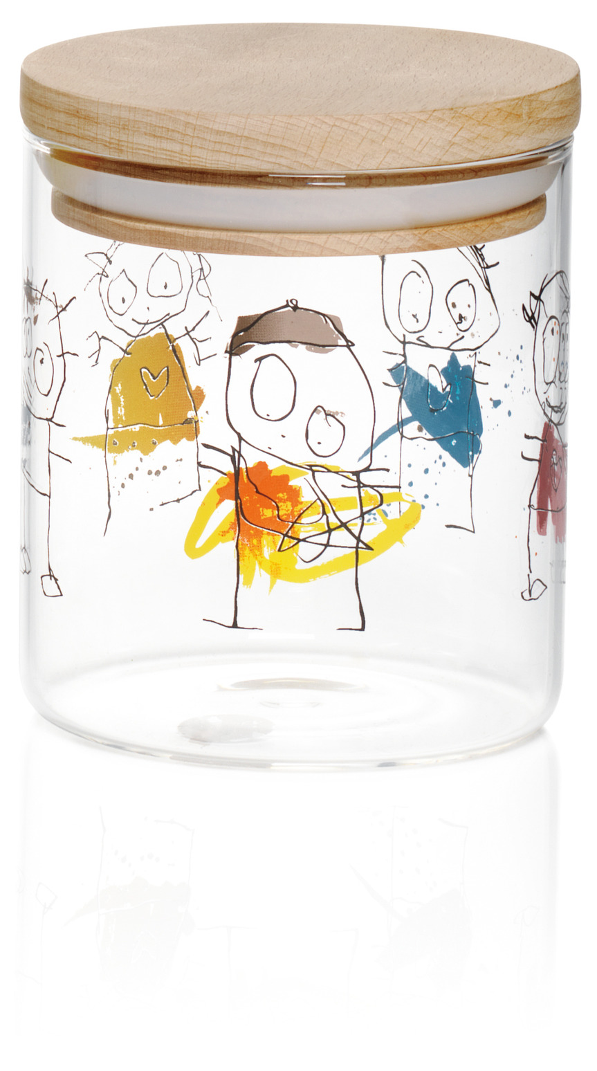 Ett av de mest framträdande elementen i designen är den lekfulla illustrationen som pryder yttersidan. Teckningen består av barnliknande figurer i olika färger och former, vilket skapar ett dynamiskt mönster som fångar blicken. Figurerna är enkla men uttrycksfulla, och de är målade med en kombination av ljusa och jordnära toner som gult, blått och rött. Deras linjer är oregelbundna och ger intrycket av handgjorda teckningar, vilket ger burken en konstnärlig och charmig framtoning.